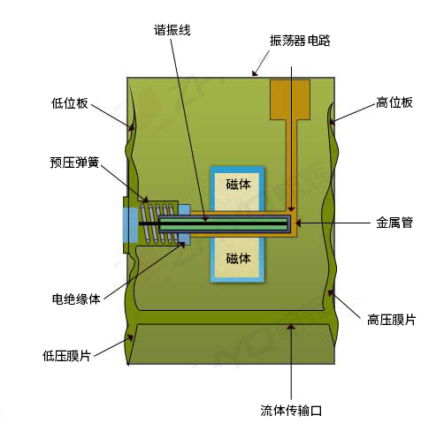 由磁場驅(qū)動的振蕩器電路會導致導線以其共振頻率振蕩。導線的一側(cè)牢固地固定到靜態(tài)部件,而另一側(cè)則連接到膜片。彈簧使電線預(yù)緊。由于過程壓力對隔膜的影響,金屬絲將在壓力升高時拉伸,而在壓力降低時收縮。共振頻率將相應(yīng)地增加或減少。數(shù)字計數(shù)器測量諧振頻率的變化,并將其信號傳遞給微芯片,該微芯片還處理線性化補償和溫度補償。