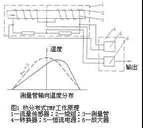 熱分布式tmf的工作原理如圖1所示,薄壁測量管3外壁繞著兩組兼作加熱器和檢測元件的繞組2,組成惠斯登電橋,由恒流電源5供給恒定熱量,通過線圈絕緣層、管壁、流體邊界層傳導(dǎo)熱量給管內(nèi)流體。邊界層內(nèi)熱的傳遞可以看作熱傳導(dǎo)方式實現(xiàn)的。在流量為零時,測量管上的溫度分布如圖下部虛線所示,相對于測量管中心的上下游是對稱的,由線圈和電阻組成的電橋處于平衡狀態(tài);當(dāng)流體流動時,流體將上游的部分熱量帶給下游,導(dǎo)致溫度分布變化如實線所示,由電橋測出兩組線圈電阻值的變化,求得兩組線圈平均溫度差δt。便可按下式導(dǎo)出質(zhì)量流量qm,即
