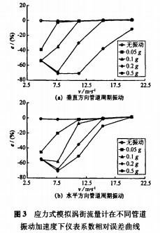 為了對(duì)比不同方向管道振動(dòng)對(duì)渦街流量計(jì)測(cè)量的影響,將管道振動(dòng)改為水平方向重新進(jìn)行試驗(yàn),得到圖3(b)曲線。通過與圖3(a)比較,發(fā)現(xiàn)兩種情況下流速及振動(dòng)加速度對(duì)儀表系數(shù)相對(duì)誤差的影響趨勢(shì)類似。依據(jù)先前擬定的抗振標(biāo)準(zhǔn),應(yīng)力式模擬