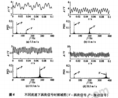 為了觀測(cè)管道周期振動(dòng)下渦街流量信號(hào)的特征,利用NI USB-6009數(shù)據(jù)采集卡對(duì)渦街正弦信號(hào)進(jìn)行采樣。以垂直方向管道振動(dòng)加速度為0.1g為例,給出了不同流速下渦街信號(hào)的時(shí)頻域圖,如圖4所示。由時(shí)域部分可知,管道振動(dòng)下渦街流量傳感器輸出的信號(hào)為真實(shí)旋渦脫落信號(hào)和管道振動(dòng)信號(hào)的合成信號(hào)。低流速(≤1lm/s)時(shí),管道振動(dòng)信號(hào)強(qiáng)、占主要成分,渦街信號(hào)疊加在其上;隨著流速變大(11~20.5m/s),渦街信號(hào)逐漸顯露出來成為主要成分、淹沒振動(dòng)信號(hào)。由頻域可知,振動(dòng)信號(hào)成分較單一,呈尖峰狀,幅值為定值,不隨流速變化而變,除40Hz基頻外還有2、3倍頻出現(xiàn);而渦街信號(hào)成分稍復(fù)雜,呈塔峰狀,幅值隨流速變大而迅速增強(qiáng),頻譜能量占總能量比重也隨流速增加而變大。