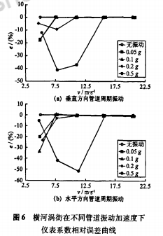 以應(yīng)力式模擬渦街流量計(jì)為被測(cè)對(duì)象,在5m/s、7.5m/s、11m/s、15.5m/s、20.5m/s流速下,分別進(jìn)行了無振動(dòng)和施加管道周期振動(dòng)的實(shí)流標(biāo)定試驗(yàn)。管道振動(dòng)方向?yàn)榇怪狈较蚝退椒较?,加速度?.05-0.5g。根據(jù)試驗(yàn)數(shù)據(jù),繪制出不同管道振動(dòng)加速度下渦街儀表系數(shù)相對(duì)于無管道振動(dòng)時(shí)平均儀表系數(shù)的相對(duì)誤差曲線,垂直方向結(jié)果如圖3(a)所示。