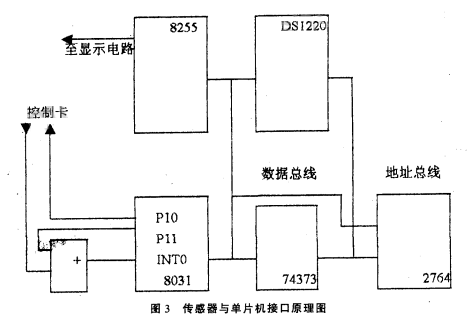 圖3中,單片機8031、74373和2764組成單片機核心電路,8255為顯示電路接口,DSl220為不揮發(fā)RAM,用其存儲流量可保證斷電后流量不丟失。工作時8031每隔一個采樣周期先啟動定時器T1,然后通過PIO引腳向控制卡發(fā)控制信號,換能器發(fā)一聲波經(jīng)被測污水反射由換能器接收,控制卡的邏輯輸出端輸出一脈沖,脈沖信號經(jīng)過或門進入INTO腳,引起中斷請求。在中斷服務程序中從定時器中取出定時值,計算出對應的液位。由于傳感器在發(fā)出聲波后,在4MS以內會產(chǎn)生無用的盲區(qū)脈沖,所以在P10向控制卡發(fā)控制脈沖的同時,通過P11引腳發(fā)一個4ms的高電平封鎖信號,防止“盲區(qū)脈沖”通過或門進入INTO引腳。