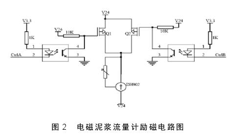 圖中的勵磁電路工作內(nèi)容是控制儀表的工作磁場。其作用原理為 :單片機 MSP430F2418 定時器產(chǎn)生了雙頻矩形波,并經(jīng)光耦隔離后與兩片場效應(yīng)管組成了開關(guān)電路,從而實現(xiàn)了泥漿流量計使用的通斷功能。另一個電路 DH902 是恒流管,其為設(shè)備使用提供恒定的勵磁電流。具體來說,當(dāng) MCU 定時器的脈沖寬度調(diào)制(PWM)輸出后,經(jīng)過濾波就能有效控制勵磁電流的幅值,進(jìn)而產(chǎn)出雙頻矩形波。如圖 2 所示,為電磁泥漿流量計勵磁電路圖。
