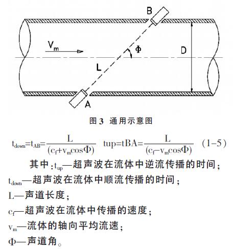 2、超聲流量計(jì)以測量超聲波在流動介質(zhì)中傳播的時間與流量的關(guān)系為原理。通常認(rèn)為超聲波在流體中的實(shí)際傳播速度是由介質(zhì)靜止?fàn)顟B(tài)下超聲波的傳播速度cf和流體軸向平均流速vm在超聲波傳播方向上的分量組成。如圖,順流和逆流傳播時間與各量之間的關(guān)系是